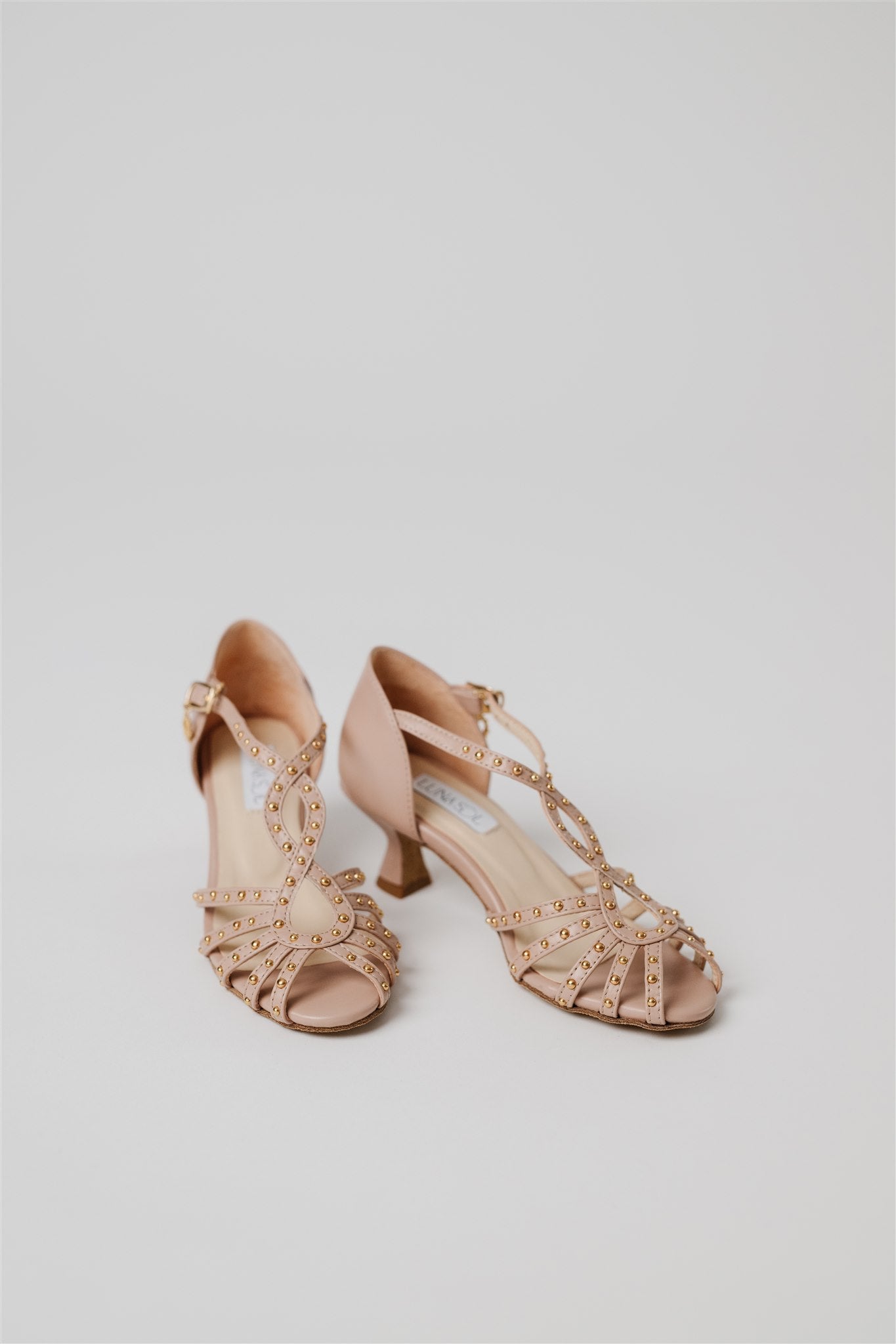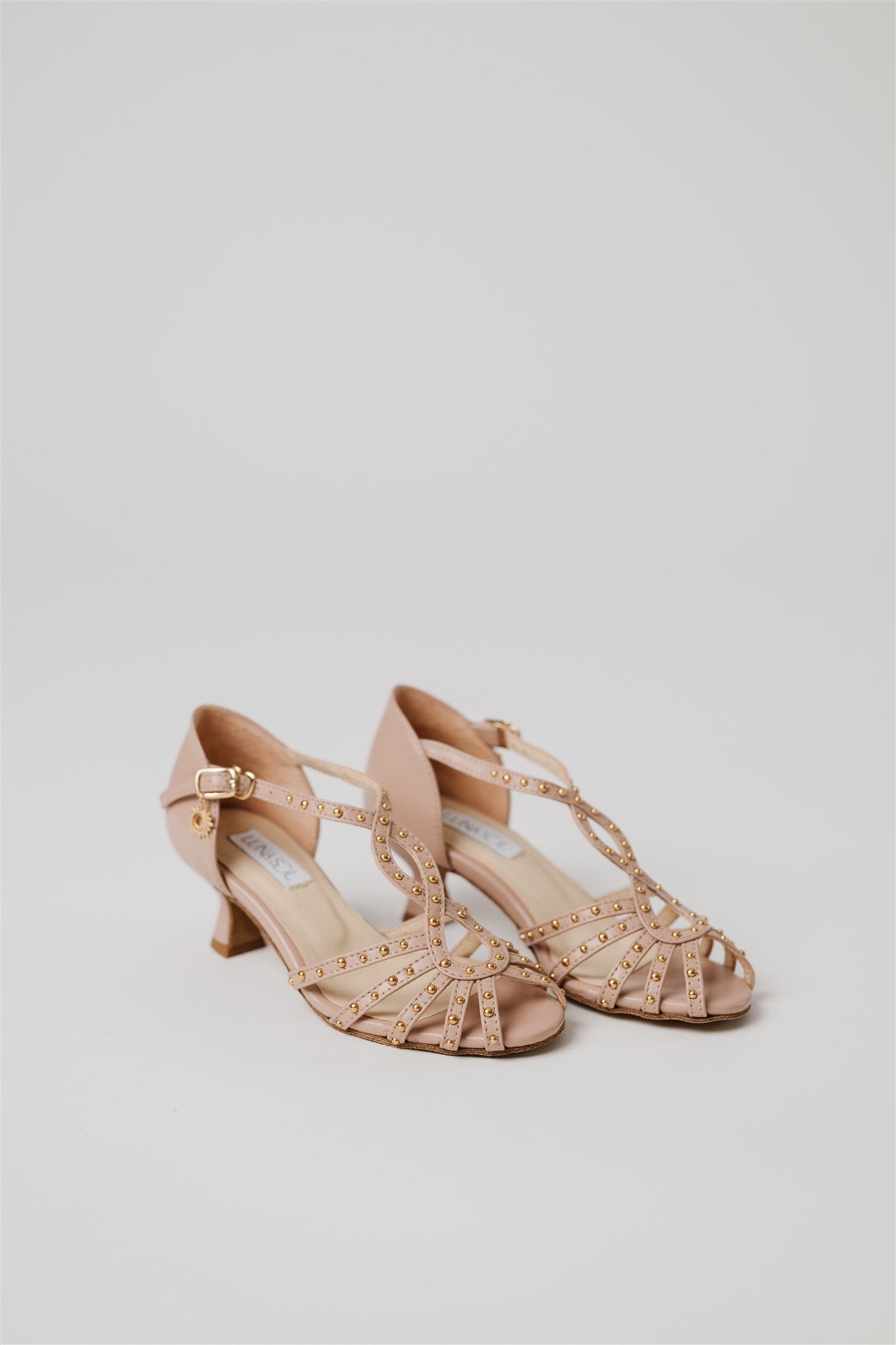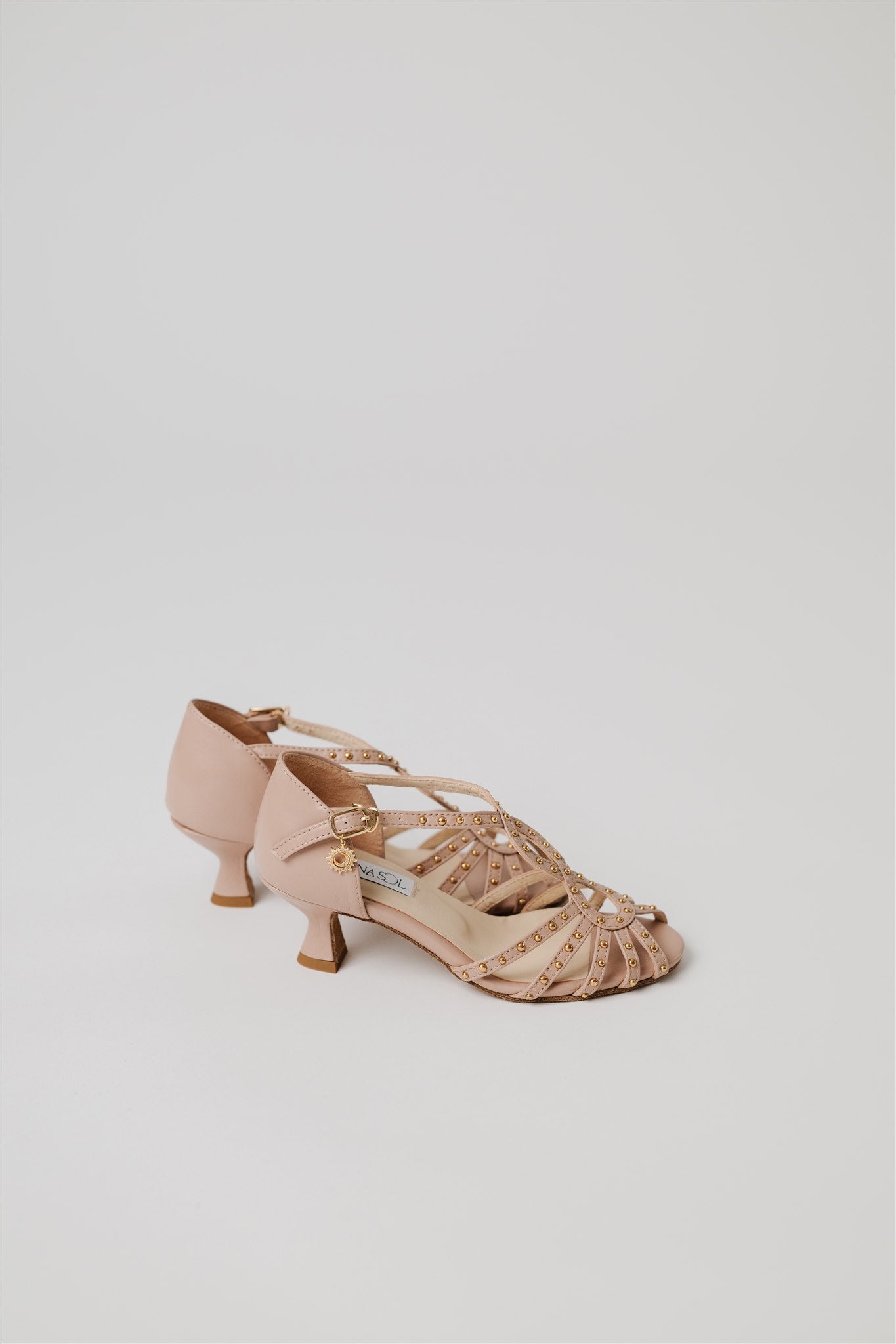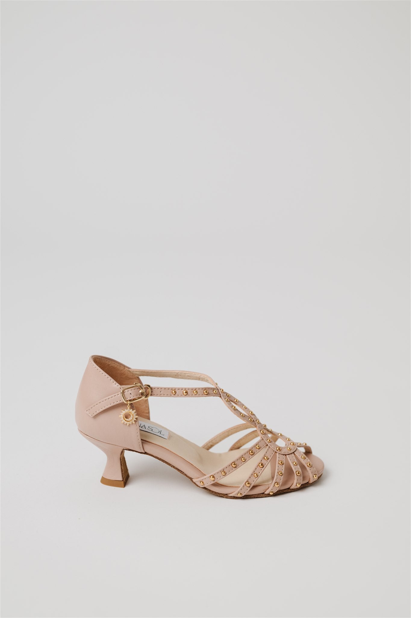 Crafted from 100% Spanish cow leather in a leg-lengthening blush nude and lined in buttery-soft Spanish goatskin, this silhouette blends la dolce vita charm with the comfort and structure dancers need. Gold grommets catch the light just enough to make a statement—whether you're dancing through a salsa social or heading to an outdoor rehearsal dinner.